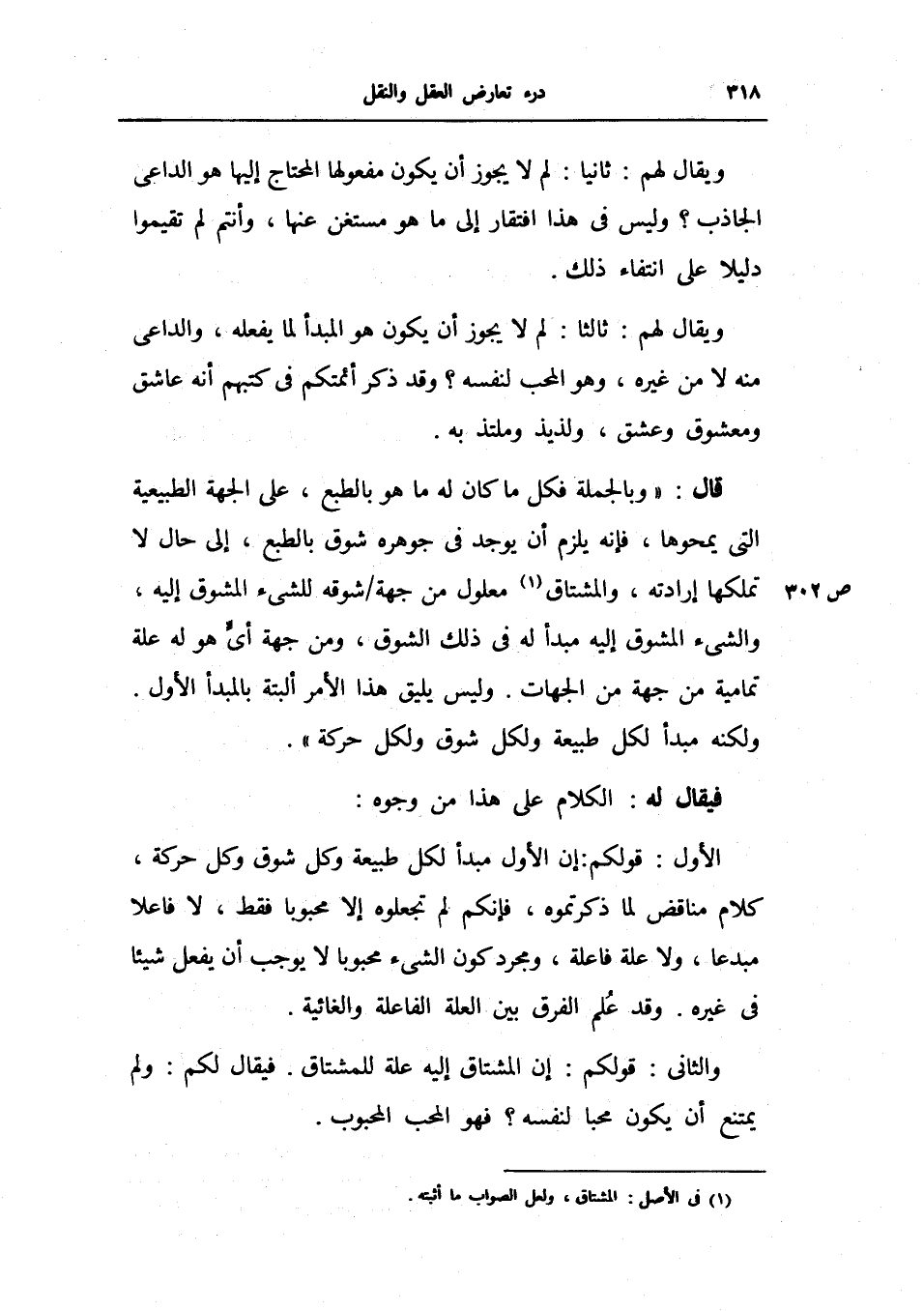 الأول: قولكم: إن الأول مبدأ لكل طبيعة وكل شوق وكل حركة، كلام مناقض لما ذكرتموه، فإنكم لم تجعلوه إلا محبوباً فقط، لا فاعلاً مبدعاً، ولا علة فاعلة، ومجرد كون الشيء محبوباً لا يوجب أن يفعل شيئاً في غيره.