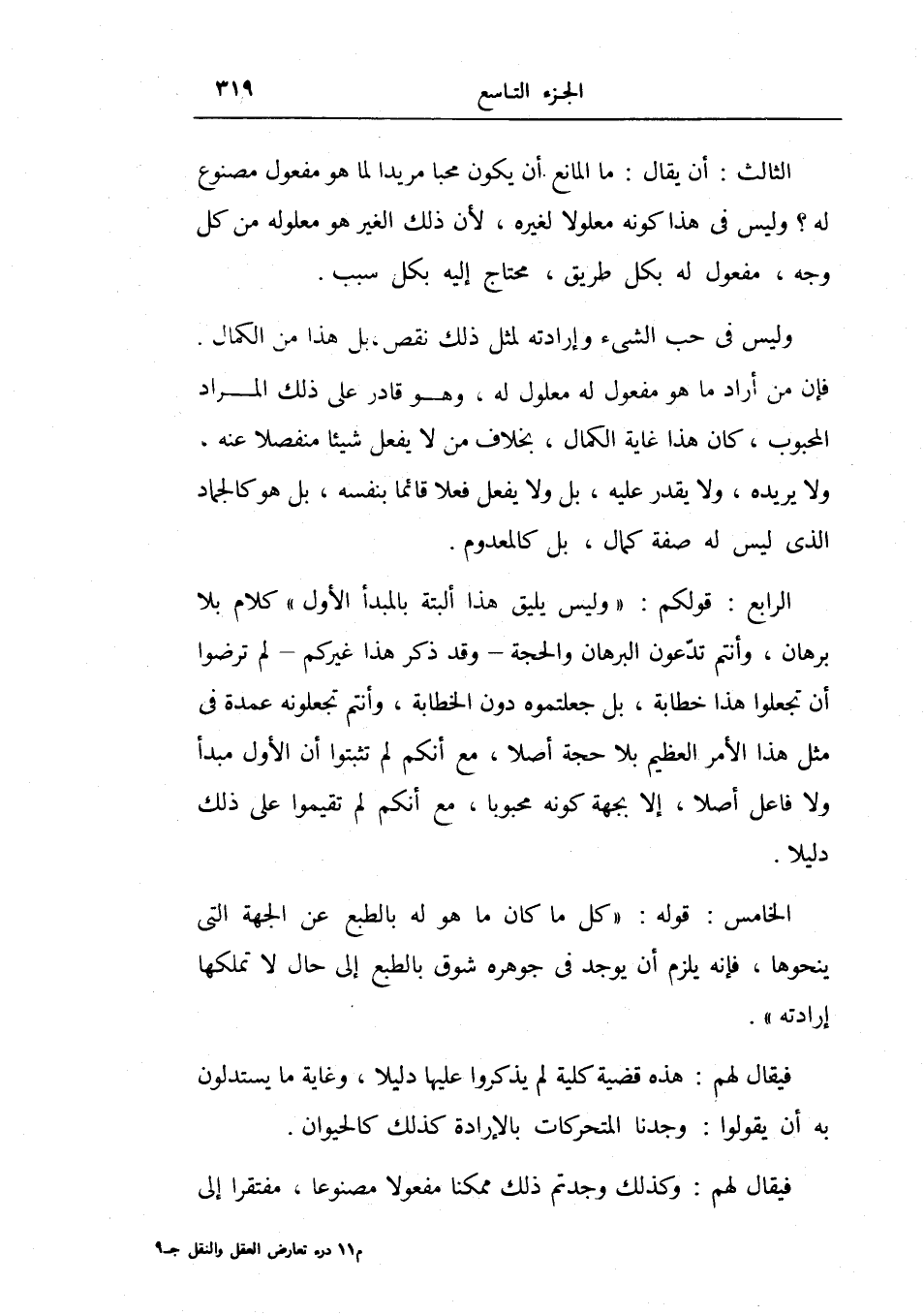 الثالث: أن يقال: ما المانع أن يكون محباً مريداً لما هو مفعول مصنوع له؟ وليس في هذا كونه معلولاً لغيره، لأن ذلك الغير هو معلوله من كل وجه، مفعول له بكل طريق، محتاج إليه بكل سبب.