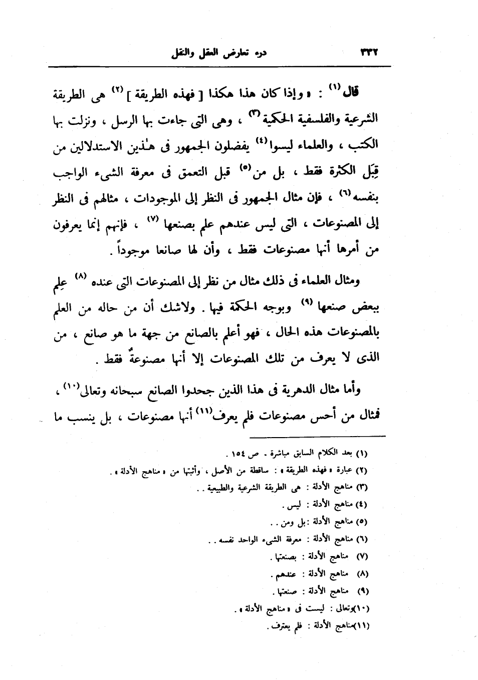 قال: وإذا كان هذا هكذا فهذه الطريقة هي الطريقة الشرعية والفلسفية الحكمية، وهي التي جاءت بها الرسل، ونزلت بها الكتب، والعلماء ليسوا يفضلون الجمهور في هذين الاستدلالين من قبل الكثرة فقط، بل من قبل التعمق في معرفة الشيء الواجب بنفسه، فإن مثال الجمهور في النظر إلى الموجودات، مثالهم في النظر إلى المصنوعات، التي ليس عندهم علم بصنعها، فإنهم إنما يعرفون من أمرها أنها مصنوعات فقط، وأن لها صانعاً موجوداً.