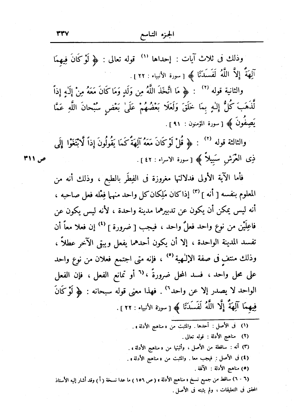 فأما الآية الأولى فدلالتها مغروزة في الفطر بالطبع، وذلك أنه من المعلوم بنفسه أنه إذا كان ملكان كل واحد منهما فعله فعل صاحبه، أه ليس يمكن أن يكون عن تدبيرهما مدينة واحدة، لأنه ليس يكون عن فاعلين من نوع واحد فعل واحد، فيجب ضرورة إن فعلا معاً أن تفسد المدينة الواحدة، إلا أن يكون أحدهما يفعل ويبقى الآخر عطلاً، وذلك منتف في صفة الإلهية، فإنه متى اجتمع فعلان من نوع واحد على محل واحد، فسد المحل ضرورة، أو تمانع الفعل، فإن الفعل الواحد لا يصدر إلا عن واحد.