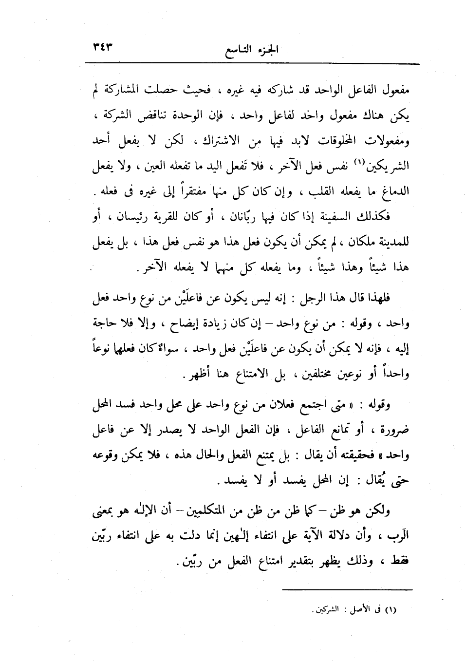 مفعول الفاعل الواحد قد شاركه فيه غيره، فحيث حصلت المشاركة لم يكن هناك مفعول واحد لفاعل واحد، فإن الوحدة تناقض الشركة، ومفعولات المخلوقات لا بد فيها من الاشتراك، لكن لا يفعل أحد الشريكين نفس فعل الآخر، فلا تفعل اليد ما تفعله العين، ولا يفعل الدماغ ما يفعله القلب، وإن كان كل منها مفتقراً إلى غيره في فعله.