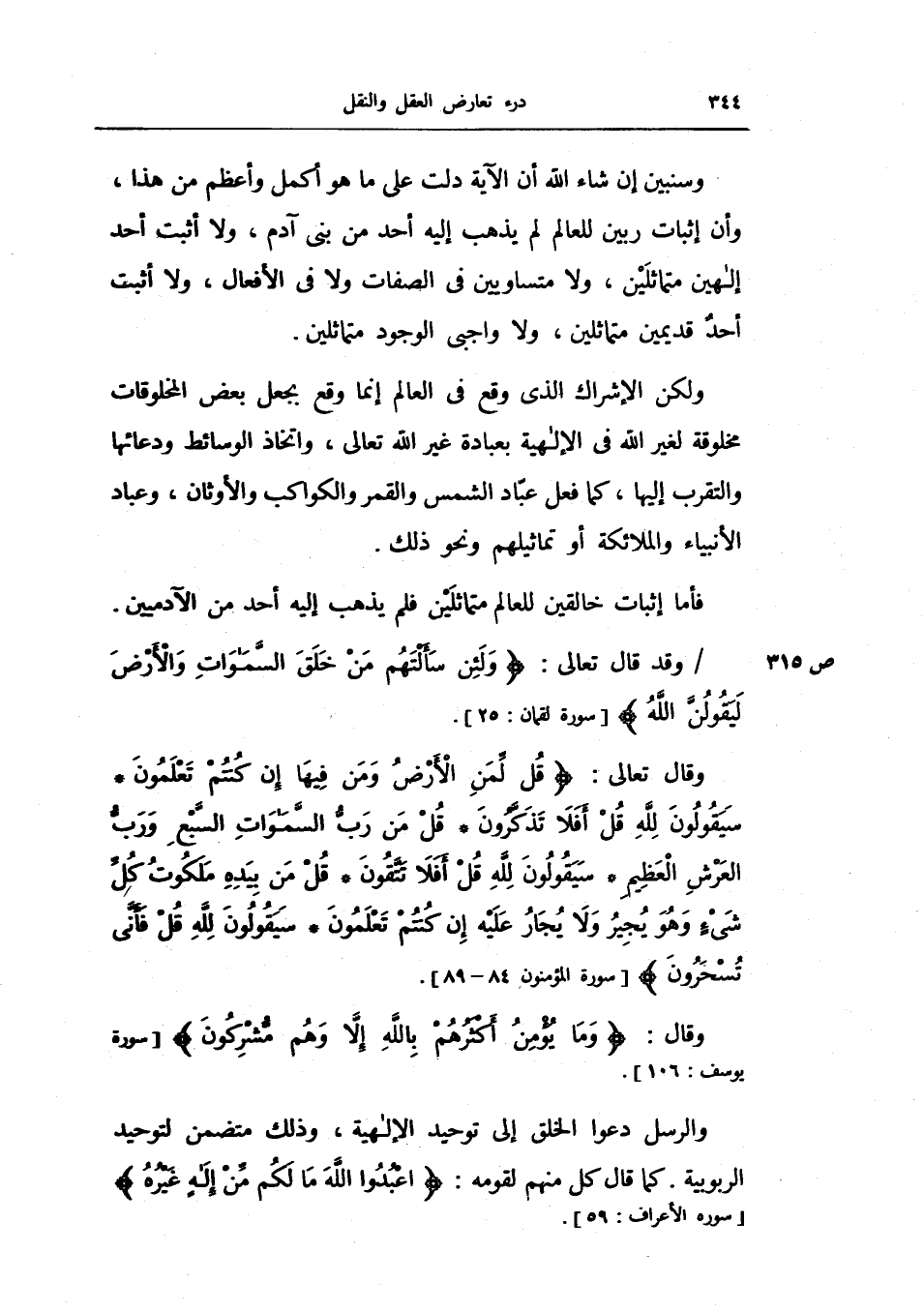 وسنبين إن شاء الله أن الآية دلت على ما هو أكمل وأعظم من هذا، وأن إثبات ربين للعالم لم يذهب إليه أحد من بني آدم، ولا أثبت أحد إلهين متماثلين، ولا متساويين في الصفات ولا في الأفعال، ولا أثبت أحد قديمين متماثلين، ولا واجبي الوجود متماثلين.