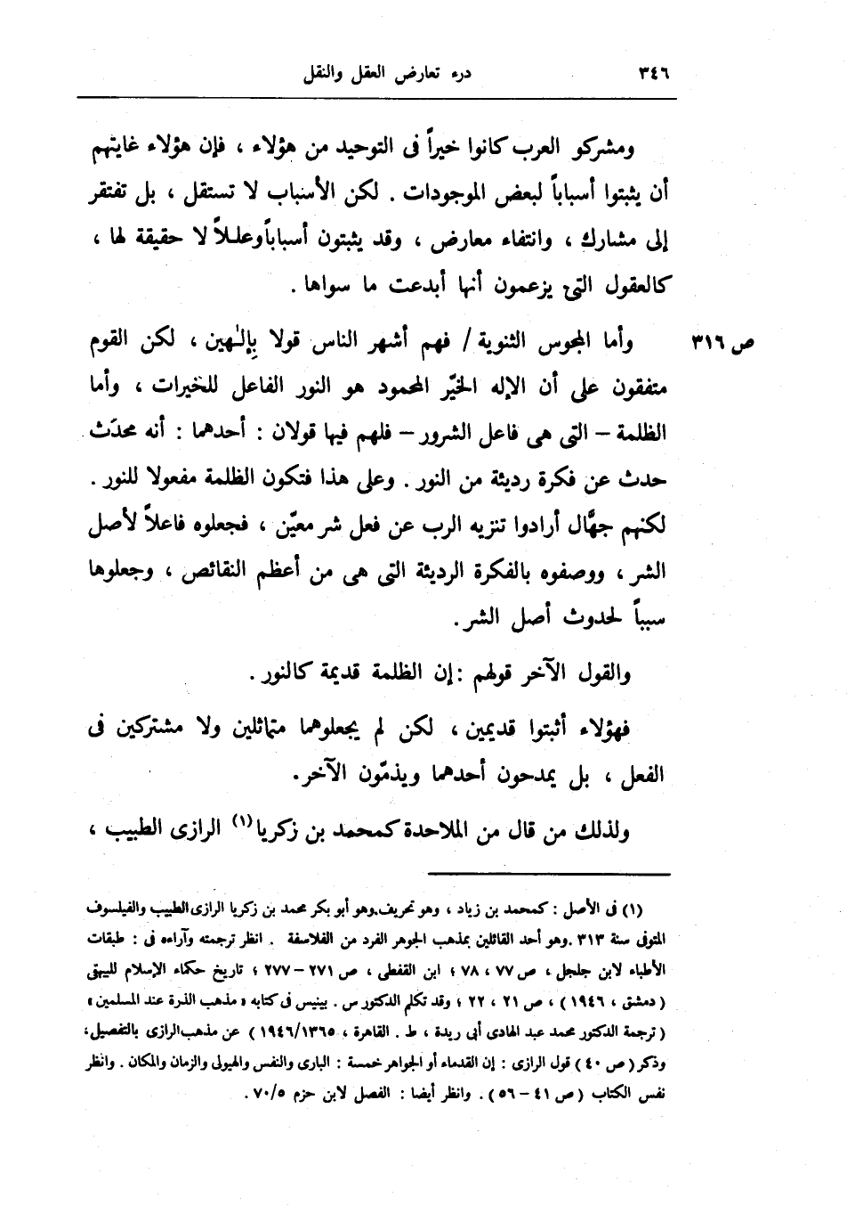 وأما المجوس الثنوية فهم أشهر الناس قولاً بإلهين، لكن القوم متفقون على أن الإله الخير المحمود هو النور الفاعل للخيرات، وأما الظلمة -التي هي فاعل الشرور- فلهم فيها قولان: أحدهما: أنه محدث حدث عن فكرة رديئة من النور.