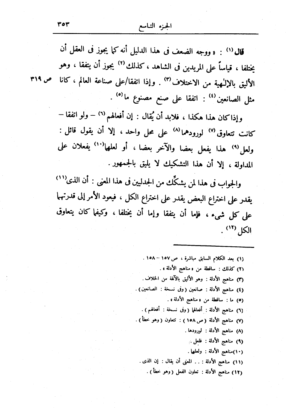 قال: ووجه الضعف في هذا الدليل أنه كما يجوز في العقل أن يختلفا، قياساً على المريدين في الشاهد، كذلك يجوز أن يتفقا، وهو الأليق بالإلهية من الاختلاف.