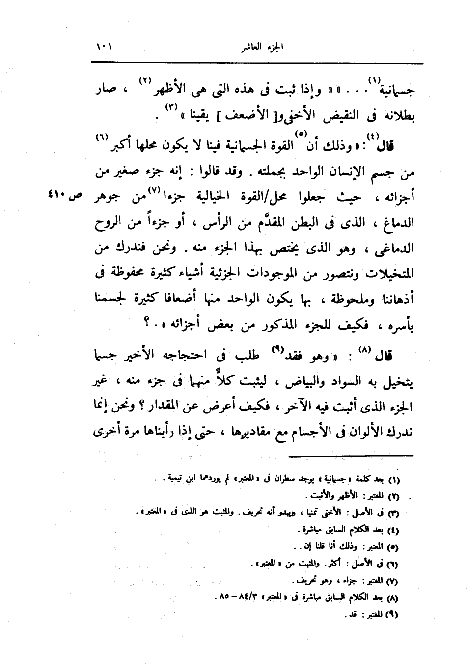 قال: وهو فقد طلب في احتجاحه الأخير جسماً يتخيل به السواد والبياض، ليثبت كلاً منهما في جزء منه، غير الجزء الذي أثبت فيه الآخر، فكيف أعرض عن المقدار؟ ونحن إنما ندرك الألوان في الأجسام مع مقاديرها، حتى غذا رأيناها مرة أخرى