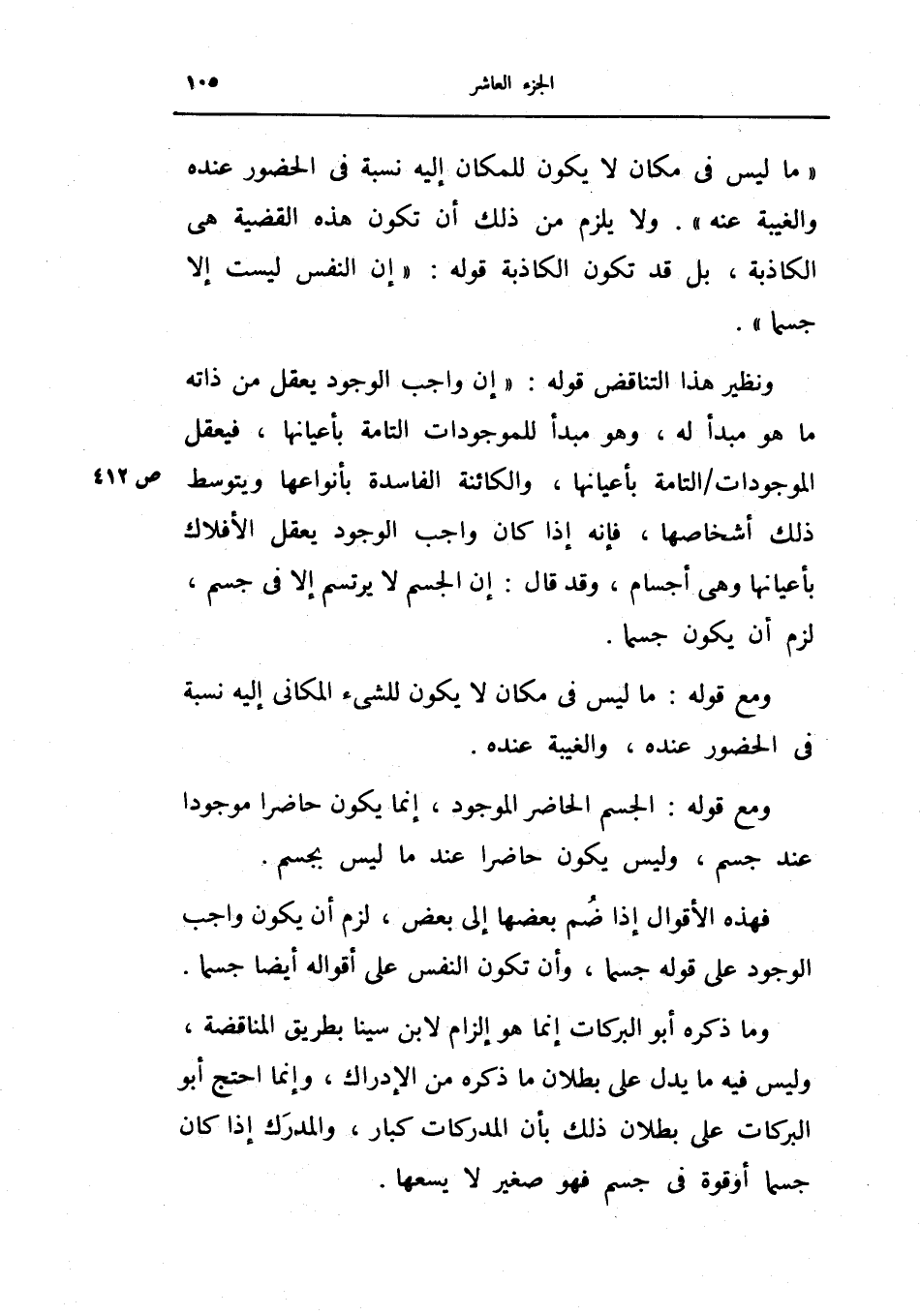 ونظير هذا التناقض قوله: إن واجب الوجود يعقل من ذاته ما هو مبدأ له، وهو مبدأ للموجودات التامة بأعيانها، فيعقل الموجودات التامة بأعيانها، والكائنة الفاسدة بأنواعها ويتوسط ذلك أشخاصها، فإنه إذا كان واجب الوجود يعقل الأفلاك بأعيانها وهي أجسام، وقد قال: إن الجسم لا يرتسم إلا في جسم لزم أن يكون جسماً.