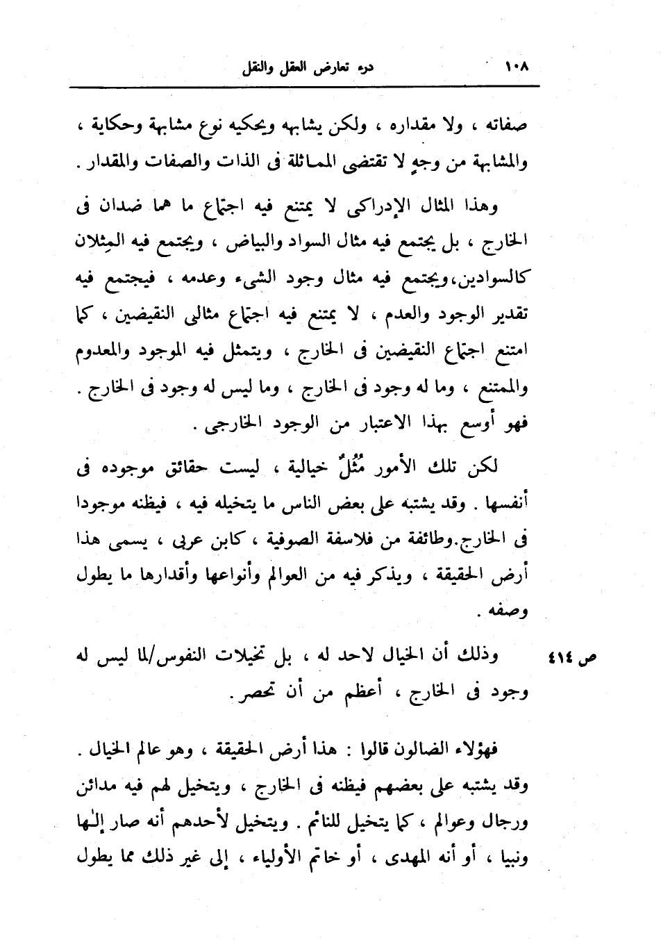 وهذا المثال الإدراكي لا يمتنع في اجتماع ما هما ضدان في الخارج، بل يجتمع فيه مثال السواد والبياض، ويجتمع فيه المثلان كالسوادين، ويجتمع فيه مثال وجود الشيء وعدمه، فيجتمع فيه تقدير الوجود والعدم، لا يمتنع فيه اجتماع مثالي النقيضين، كما امتنع اجتماع النقيضين في الخارج، ويتمثل فيه الموجود والمعدوم والممتنع، وما له وجود في الخارج، وما ليس وجود في الخارج.