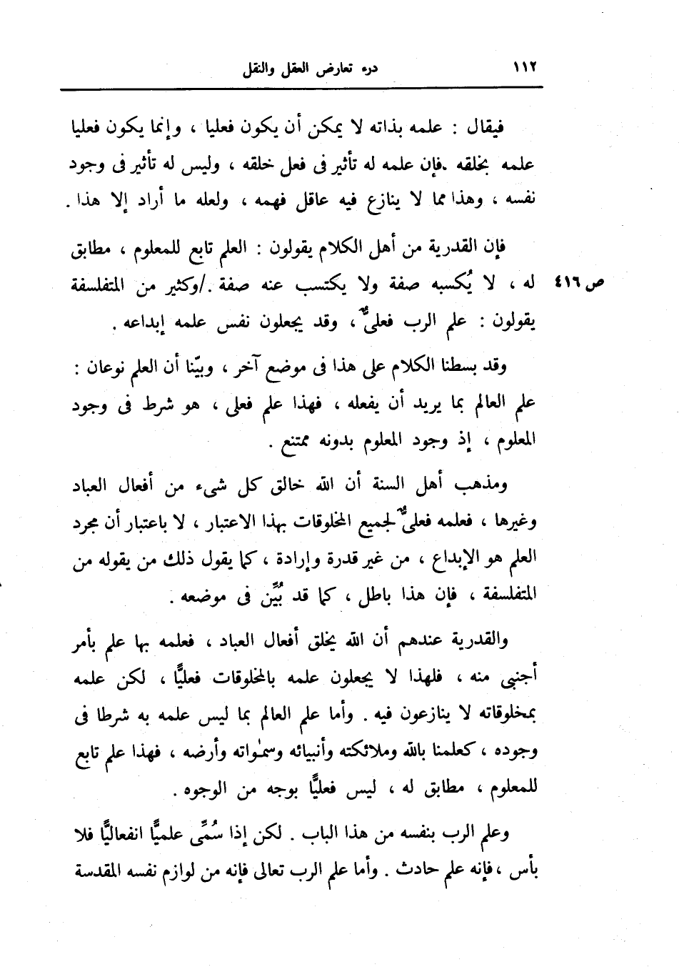 فإن القدرية من أهل الكلام يقولون: العلم تابع للمعلوم، مطابق له، لا يكسبه صفة ولا يكتسب عنه صفة.