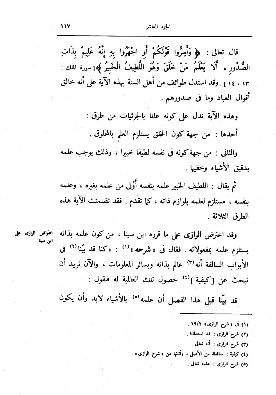 وقد اعترض الرازي على ما قرره ابن سينا، من كون علمه بذاته يستلزم علمه بمفعولاته.