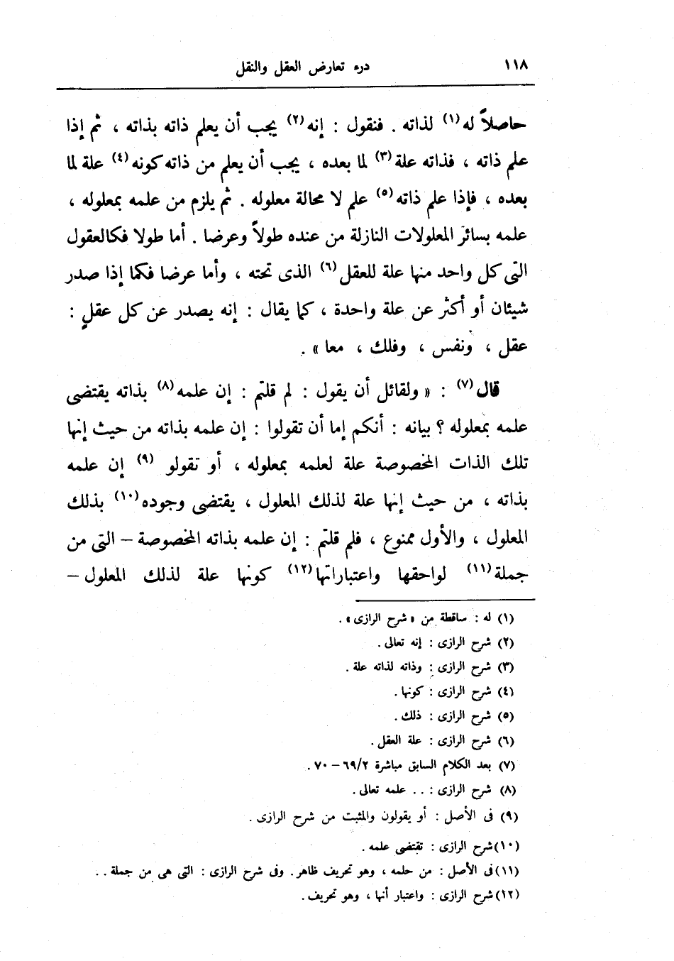 قال: ولقائل أن يقول: لم قلتم: إن علمه بذاته يقتضي علمه بمعلوله؟ بيناه: أنكم إما أن تقولوا: إن علمه بذاته من حيث إنها تلك الذات المخصوصة علة لعمله بمعلوله، أو تقولوا إن علمه بذاته، من حيث إنها علة لذلك المعلول، يقتضي وجوده بذلك المعلول، والأول ممنوع، فلم قلتم: إن علمه بذاته المخصوصة -التي من جملة لواحقها واعتباراتها كونها علة لذلك المعلول-
