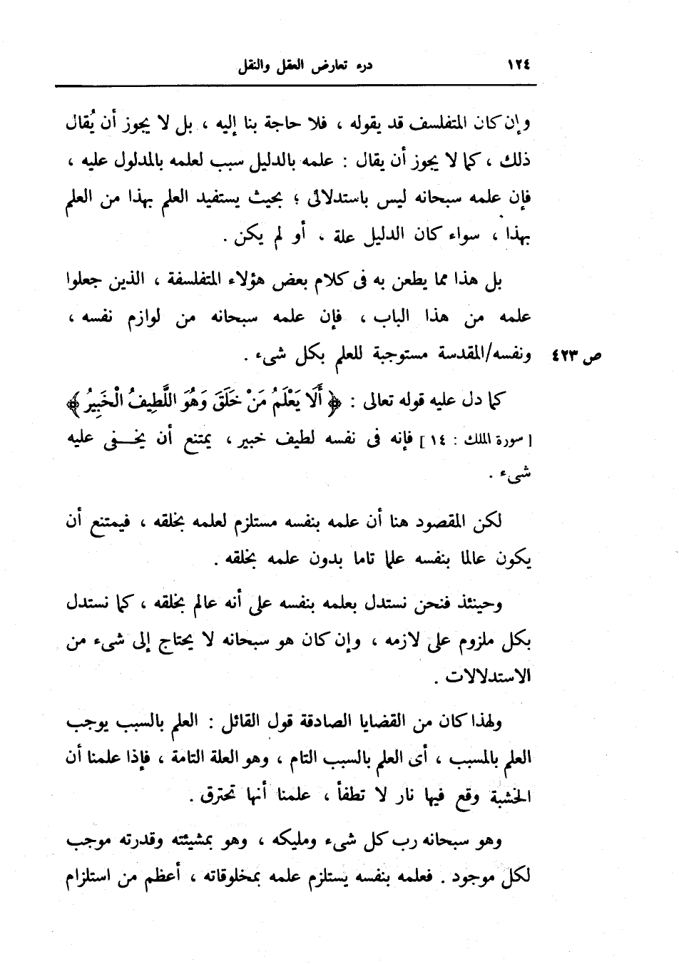 بل هذا مما يطعن به في كلام بعض هؤلاء المتفلسفة، الذين جعلوا علمه من هذا الباب، فإن علمه سبحانه من لوازم نفسه، ونفسه المقدسة مستوجبة للعلم بكل شيء.