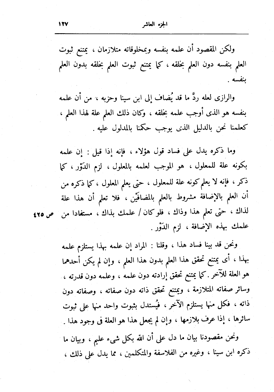 والرازي لعله رد ما قد يضاف إلى ابن سينا وحزبه، من أن علمه بنفسه هو الذي أوجب علمه بخلقه، وكان ذلك العلم علة لهذا العلم، كعلمنا نحن بالدليل الذي يوجب حكمنا بالمدلول عليه.