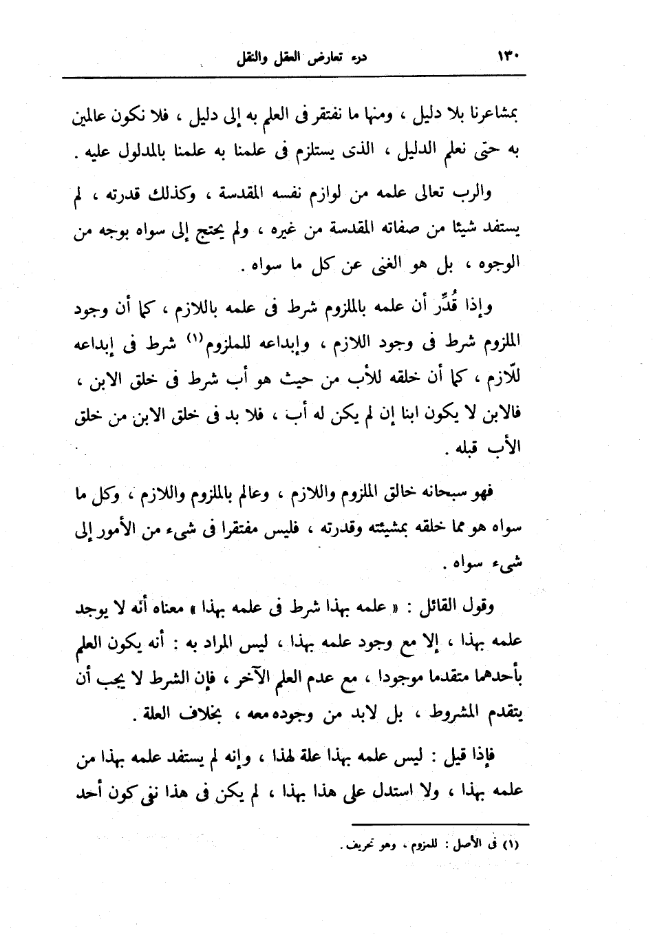 وإذا قدر أن علمه بالملزوم شرط في علمه باللازم، كما أن وجود الملزوم شرط في وجود اللازم، وإبداعه للملزوم شرط في إبداعه للازم، كما أن خلقه للأب من حيث هو أب شرط من خلق الابن، فالابن لا يكون ابناً إن لم يكن له أب، فلا بد في خلق الابن من خلق الأب قبله.