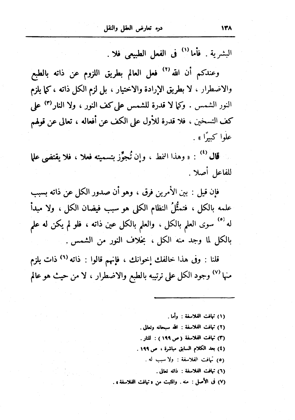 وكما لا قدرة للشمس على كف النور، ولا النار على كف التسخين، فلا قدرة للأول على الكف عن أفعاله، تعالى عن قولهم علواً كبيراً.