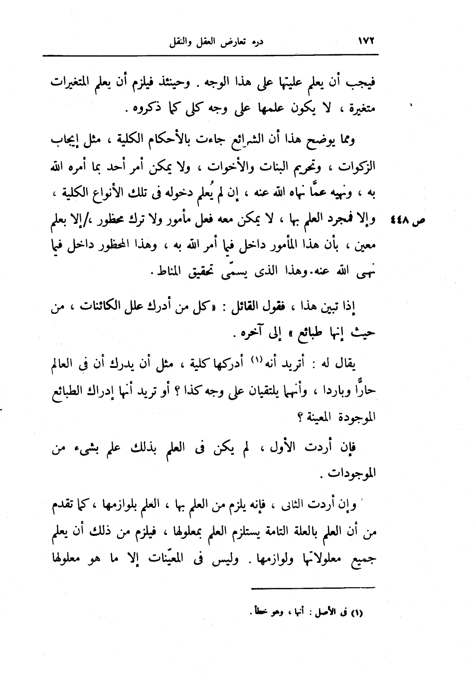 يقال له: أتريد أنه أدركها كلية، مثل أن يدرك أن في العالم حاراً وبارداً، وأنهما يلتقيان على وجه كذا؟ أو تريد أنها إدراك الطبائع الموجودة المعينة؟.