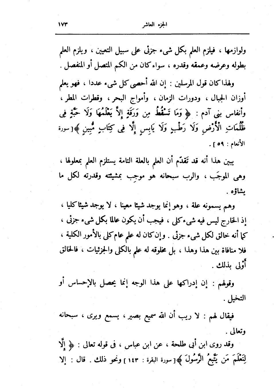 ولوازمها، فيلزم العلم بكل شيء جزئي على سبيل التعيين، ويلزم العلم بطوله وعرضه وعمقه وقدره، سواء كان من الكل المتصل أو المنفصل.