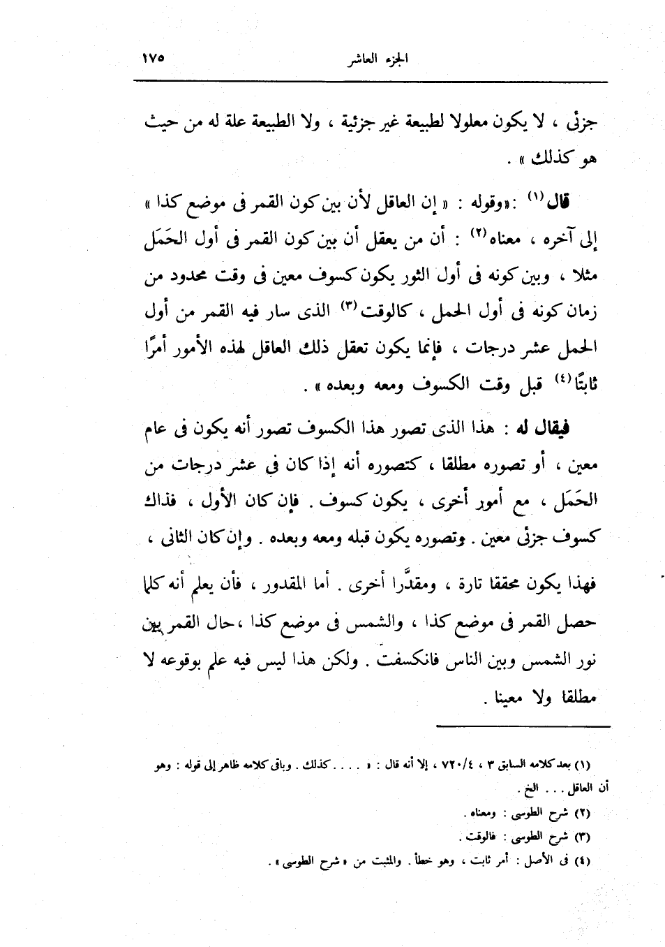 قال: وقوله: إن العاقل لأن بين كون القمر في موضع كذا إلى آخره، معناه: أن من يعقل أن بين كون القمر في أول الحمل مثلاً، وبين كونه في أول الثور يكون كسوف معين في وقت محدود من زمانه كونه في أول الحمل، كالوقت الذي سار فيه القمر من أول الحمل عشر درجات، فإنما يكون تعقل ذلك العاقل لهذه الأمور أمراً ثابتاً قبل وقت الكسوف ومعه وبعده.