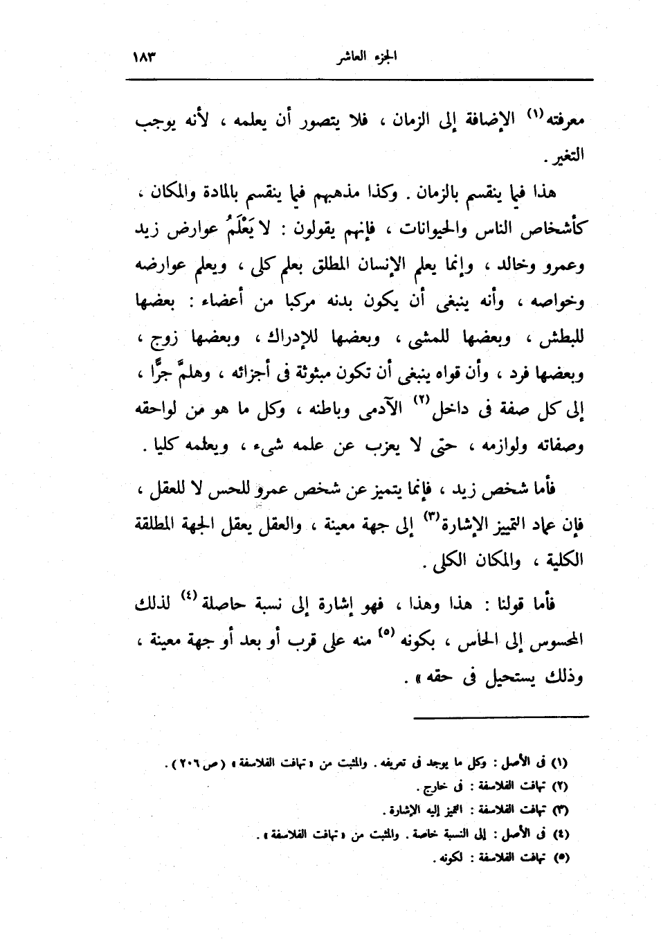 وكذا مذهبهم فيما ينقسم بالمادة والمكان، كأشخاص الناس والحيوانات، فإنهم يقولون: لا يعلم عوارض زيد وعمرو وخالد، وإنما يعلم الإنسان المطلق بعلم كلي، ويعلم عوارضه وخواصه، وأنه ينبغي أن يكون بدنه مركباً من أعضاء: بعضها للبطش، وبعضها للمشي، وبعضها للإدراك، وبعضها زوج، وبعضها فرد، وأن قواه ينبغي أن تكون مبثوثة في أجزائه، وهلم جراً، إلى كل صفة في داخل الآدمي وباطنه، وكل ما هو من لواحقه وصفاته ولوازمه، حتى لا يعزب عن علمه شيء، ويعلمه كلياً.