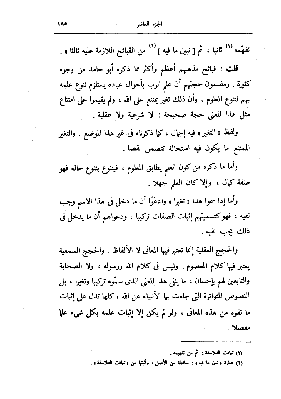 وليس في كلام الله ورسوله، ولا الصحابة والتابعين لهم بإحسان، ما ينفي هذا المعنى الذي سموه تركيباً وتغيراً، بل النصوص المتواترة التي جاءت بها الأنبياء عن الله، كلها تدل على إثبات ما نفوه من هذه المعاني، ولو لم يكن إلا إثبات علمه بكل شيء علماً مفصلاً.