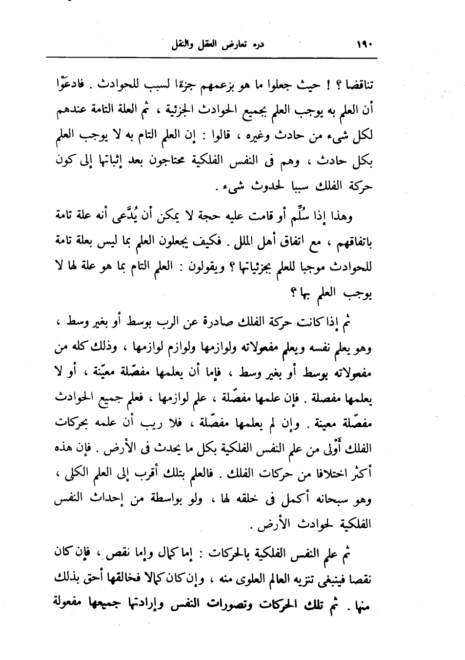 فادعوا أن العلم به يوجب العلم بجميع الحوادث الجزئية، ثم العلة التامة عندهم لكل شيء من حادث وغيره، قالوا: إن العلم التام به لا يوجب العلم بكل حادث، وهم في النفس الفلكية محتاجون بعد إثباتها إلى كون حركة الفلك سبباً لحدوث شيء.