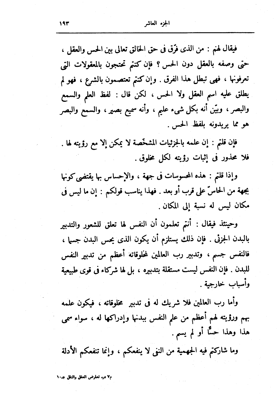 فيقال لهم: من الذي فرق في حق الخالق تعالى بين الحس والعقل حتى وصفه بالعقل دون الحس؟ فإن كنتم تحتجون بالمعقولات التي تعرفونها، فهي تبطل هذا الفرق.