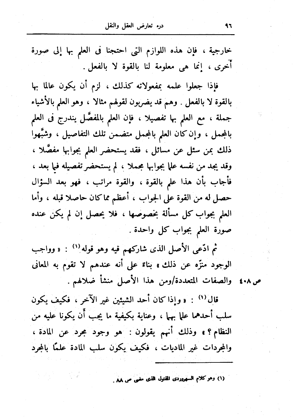 وإن كان العلم بالمجمل متضمن تلك التفاصيل، وشبهوا ذلك بمن سئل عن مسائل، فقد يستحضر العلم بجوابها مفصلاً، وقد يجد من نفسه علماً بجوابها مجملاً، لم يستحضر العلم بجوابها مفصلاً، وقد يجل من نفسه علماً بجوابها مجملاً، لم يستحضر تفصيله فيما بعد، فأجاب بأن هذا علم بالقوة، والقوة مراتب، فهو بعد السؤال حصل له من القوة على الجواب، أعظم مما كان حاصلاً قبله.