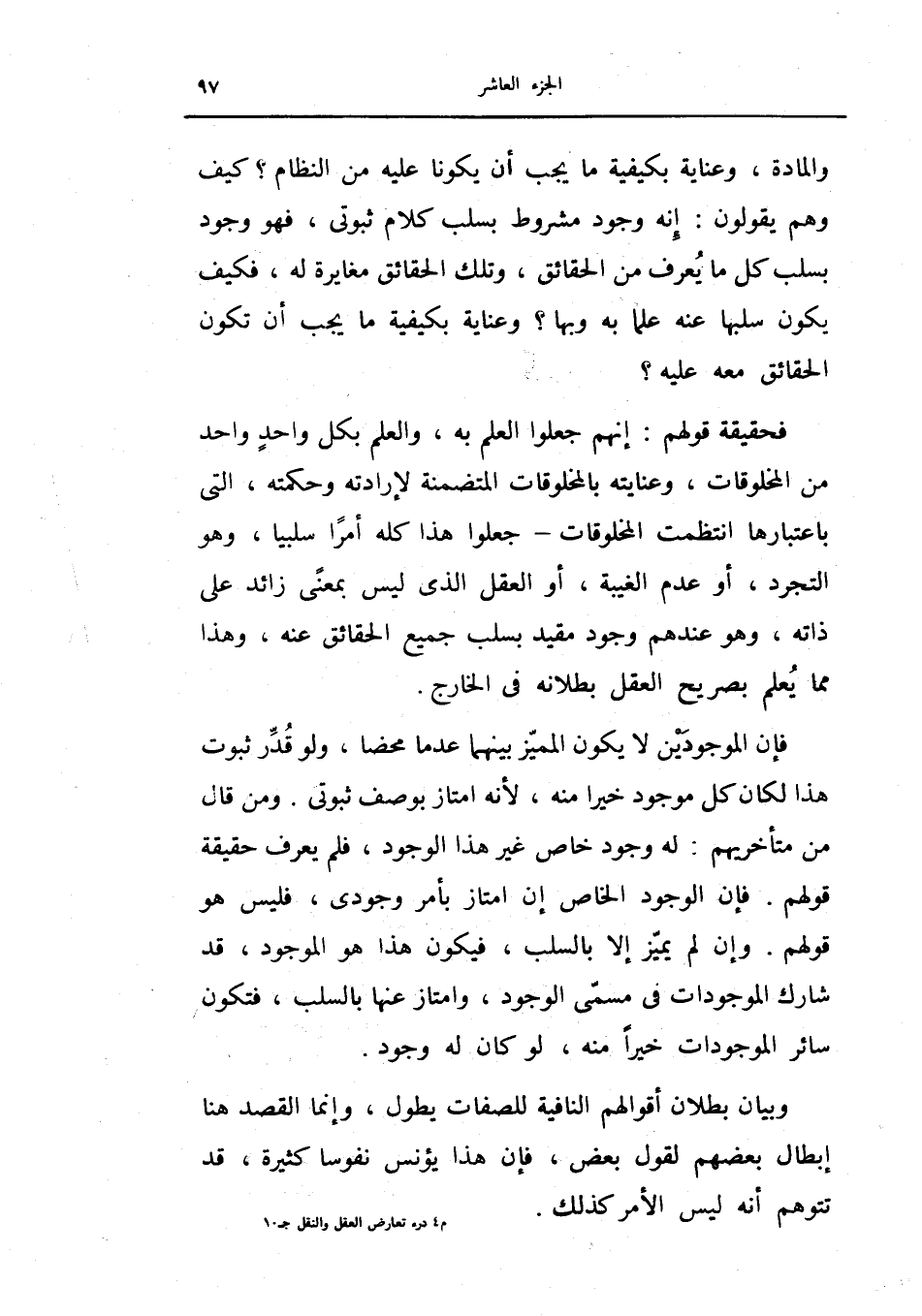 فحقيقة قولهم: إنهم جعلوا العلم به، والعلم بكل واحد واحد من المخلوقات، وعنايته بالمخلوقات المتضمنة لإرادته وحكمته، التي باعتبارها انتظمت المخلوقات -جعلوا هذا كله أمراً سلبياً، وهو التجرد، أو عدم الغيبة، أو العقل الذي ليس بمعنىً زائد على ذاته، وهو عندهم وجود مقيد بسلب جميع الحقائق عنه، وهذا مما يعلم بصريح العقل بطلانه في الخارج.