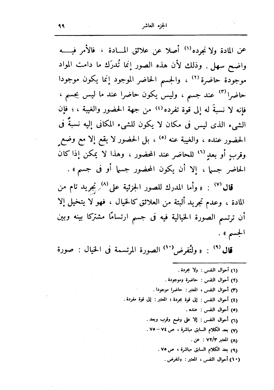 وليس يكون حاضراً عند ما ليس بجسم، فإنه لا نسبة له غلى قوة تفرده من جهة الحضور والغيبة،، فإن الشيء الذي ليس في مكان لا يكون للشيء المكاني إليه نسبة في الحضور عنده، والغيبة عنه، بل الحضور لا يقع إلا مع وضع وقرب أو بعد للحاضر عند المحضور، وهذا لا يمكن إذا كان الحاضر جسماً، إلا أن يكون المحضور جسماً او في المحضور، وهذا لا يمكن إذا كان الحاضر جسماً، إلا أن يكون المحضور جسماً أو في جسم.