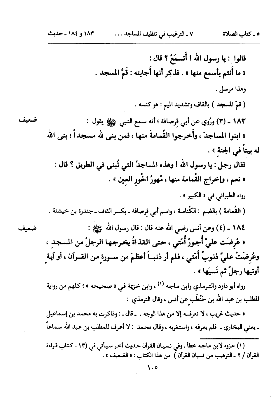 184 - (4) [ضعيف] وعن أنس رضي الله عنه قال: قال رسول الله - صلى الله عليه وسلم -: