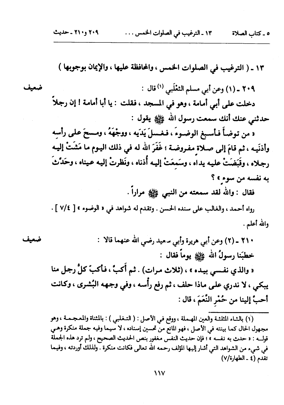(¬1) بالثاء المثلثة والعين المهملة، ووقع في الأصل: (التغلبي): بالمثناة والمعجمة، وهو مجهول الحال كما بينته في الأصل، فهو الماء من تحسين إسناده، لا سيما وفيه جملة منكرة وهي قوله: "حدث به نفسه"؛ فإن حديث النفس مغفور بنص الحديث الصحيح، ولم ترد هذه الجملة في شيء من الشواهد التي أشار إليها المؤلف رحمه الله تعالى فكانت منكرة. ولذلك أوردته، وفيما تقدم (4 - الطهارة/ 7).