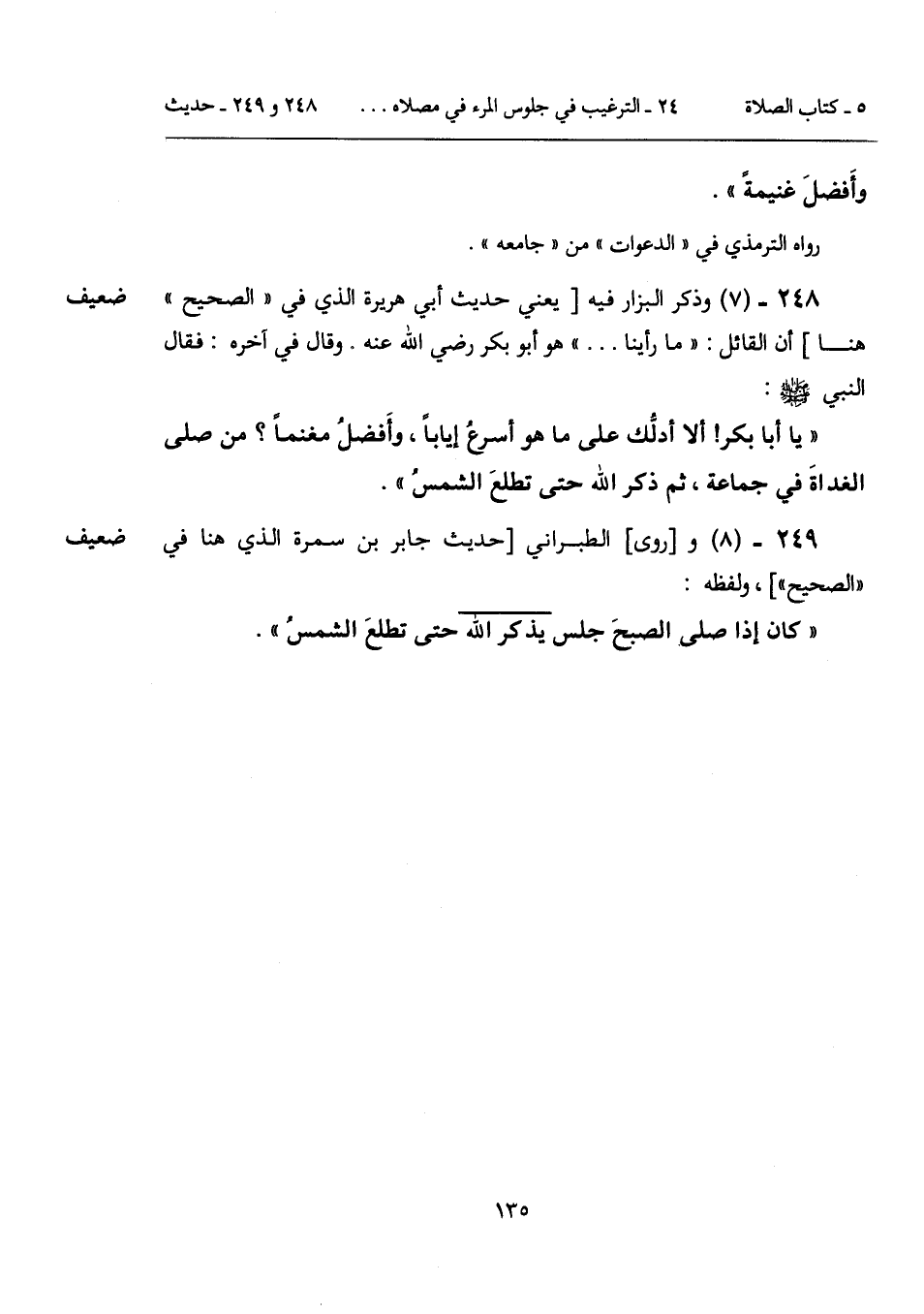 "يا أبا بكر! ألا أدلُّك على ما هو أسرعُ إياباً، وأَفضلُ مغنماً؟ من صلى الغداةَ في جماعة، ثم ذكر الله حتى تطلعَ الشمسُ".