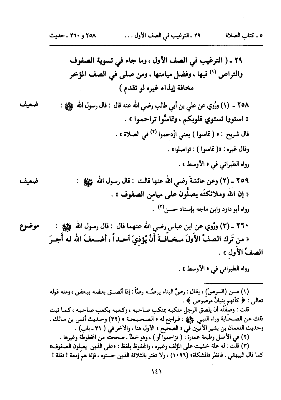 29 - (الترغيب في الصف الأول، وما جاء في تسوية الصفوف والتراص (¬1) فيها، وفضل ميامنها، ومن صلى في الصف المؤخر مخافة إيذاء غيره لو تقدم)