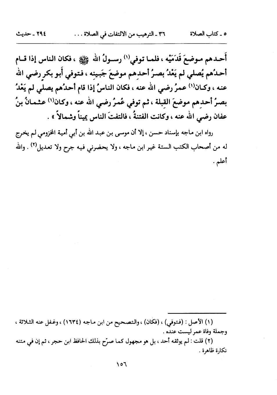 أَحدهم موضعَ قَدَمَيْه، فلما توفي (¬1) رسولُ الله - صلى الله عليه وسلم - ,فكان الناس إذا قام أحدُهم يُصلي لم يَعْدُ بصرُ أحدِهم موضعَ جَبينِه، فتوفي أَبو بكرٍ رضي الله عنه، وكان (1) عمرُ رضي الله عنه، فكان الناسُ إذا قام أحدُهم يصلي لم يَعْدُ بصرُ أحدِهم موضعَ القِبلة، ثم توفي عُمرُ رضي الله عنه، وكان (1) عثمانُ بنُ عفان رضي الله عنه، وكانت الفتنةُ، فالتفتَ الناس يميناً وشمالاً".
