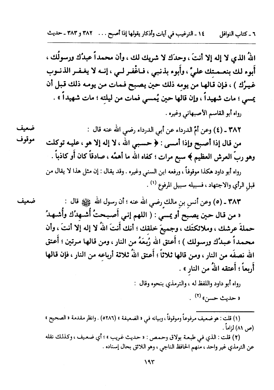 "من قال حين يصبح أو يمسي: (اللهم إني أَصبحتُ أُشهِدُك وأُشهدُ حملةَ عرشك، وملائكتَك، وجميعَ خلقِك؛ أنك أَنتَ اللهُ لا إله إلا أنتَ، وأن محمداً عبدُك ورسولك)؛ أَعتق الله رُبعَهُ من النار، ومن قالها مرتين؛ أَعتق الله نصفَه من النار، ومن قالها ثلاثاً، أَعتق اللهُ ثلاثة أرباعِه من النار، فإن قالها أَربعاً؛ أَعتقه اللهُ من النارِ".