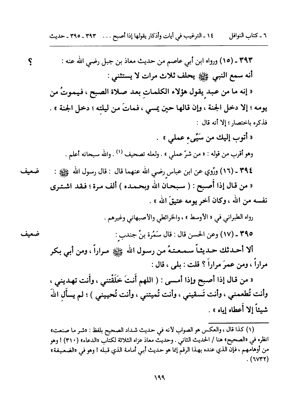 (¬1) كذا قال، والعكس هو الصواب لأنه في حديث شداد الصحيح بلفظ: "شر ما صنعت" انظره في "الصحيح" هنا/ الحديث الثاني. وحديث معاذ عزاه الثلاثة لكتاب "الدعاء" (310)! وهو من أوهامهم، فإن الذي عنده بهذا الرقم إنما هو حديث أبي أمامة الذي قبله! وهو في "الضعيفة" (6732).