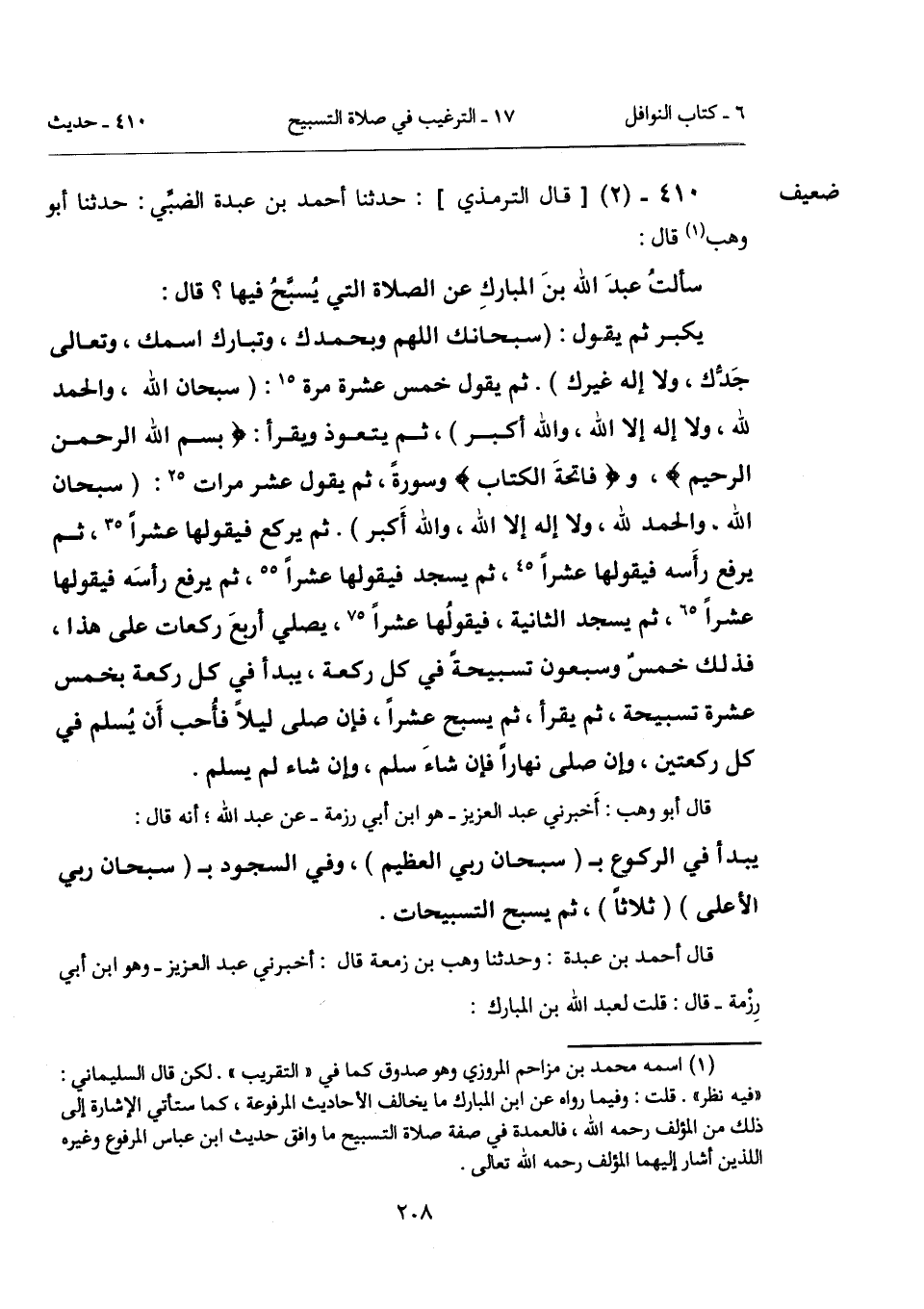 (¬1) اسمه محمد بن مزاحم المروزي وهو صدوق كما في "التقريب". لكن قال السليماني: "فيه نظر". قلت: وفيما رواه عن ابن المبارك ما يخالف الأحاديث المرفوعة، كما ستأتي الإشارة إلى ذلك من المؤلف رحمه الله، فالعمدة في صفة صلاة التسبيح ما وافق حديث ابن عباس المرفوع وغيره اللذين أشار إليهما المؤلف رحمه الله تعالى.