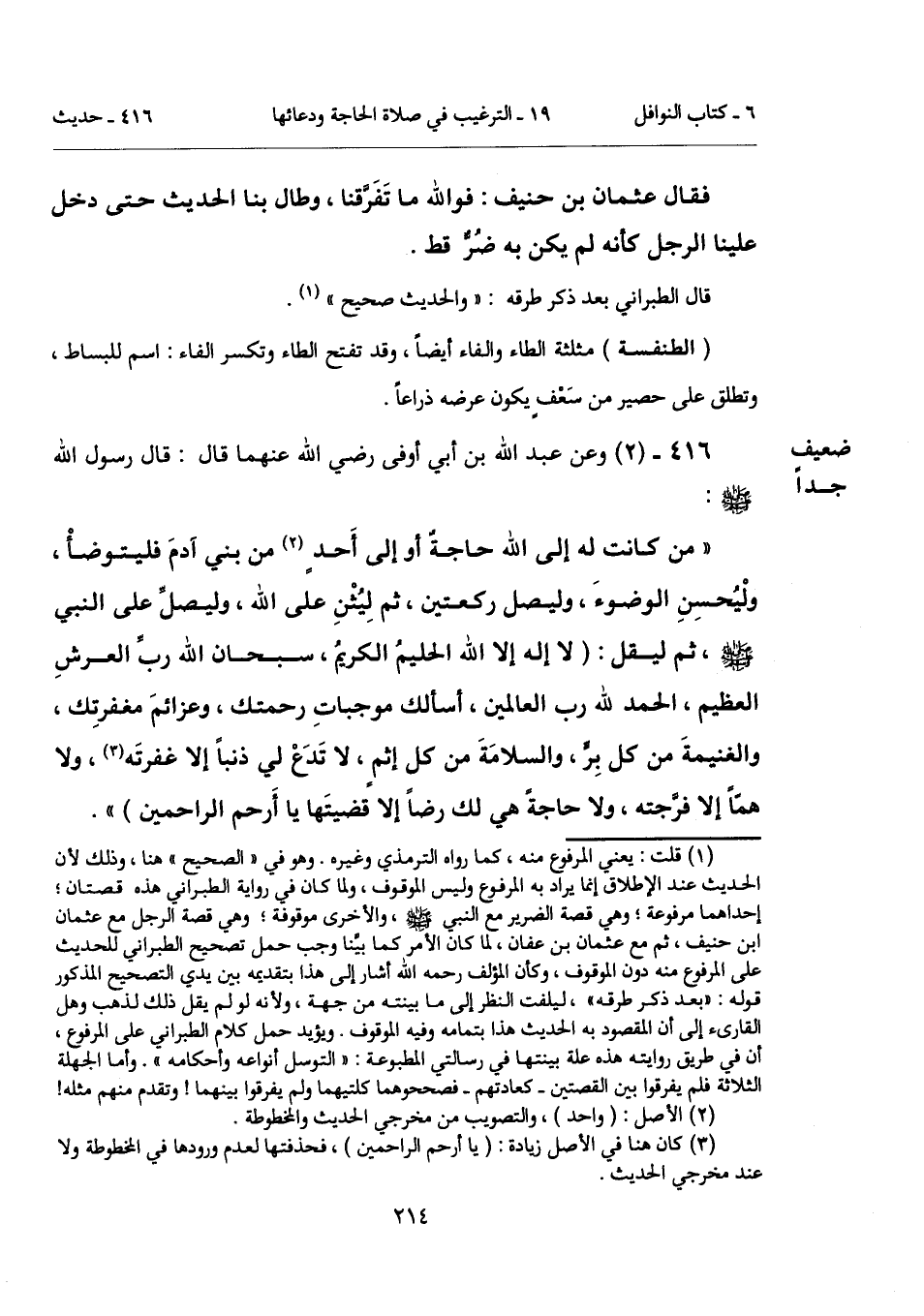 (¬1) قلت: يعني المرفوع منه، كما رواه الترمذي وغيره. وهو في "الصحيح" هنا، وذلك لأن الحديث عند الإطلاق إنما يراد به المرفوع وليس الموقوف، ولما كان في رواية الطبراني هذه قصتان؛ إحداهما مرفوعة؛ وهي قصة الضرير مع النبي - صلى الله عليه وسلم -، والأخرى موقوفة؛ وهي قصة الرجل مع عثمان ابن حنيف، ثم مع عثمان بن عفان، لما كان الأمر كما بيَّنا وجب حمل تصحيح الطبراني للحديث على المرفوع منه دون الموقوف، وكأن المؤلف رحمه الله أشار إلى هذا بتقديمه بين يدي التصحيح المذكور قوله: "بعد ذكر طرقه"، ليلفت النظر إلى ما بينته من جهة، ولأنه لو لم يقل ذلك لذهب وهل القارىء إلى أن المقصود به الحديث هذا بتمامه وفيه الموقوف. ويؤيد حمل كلام الطبراني على المرفوع، أن في طريق روايته هذه علة بينتها في رسالتي المطبوعة: "التوسل أنواعه وأحكامه". وأما الجهلة الثلاثة فلم يفرقوا بين القصتين -كعادتهم- فصححوهما كلتيهما ولم يفرقوا بينهما! وتقدم منهم مثله!