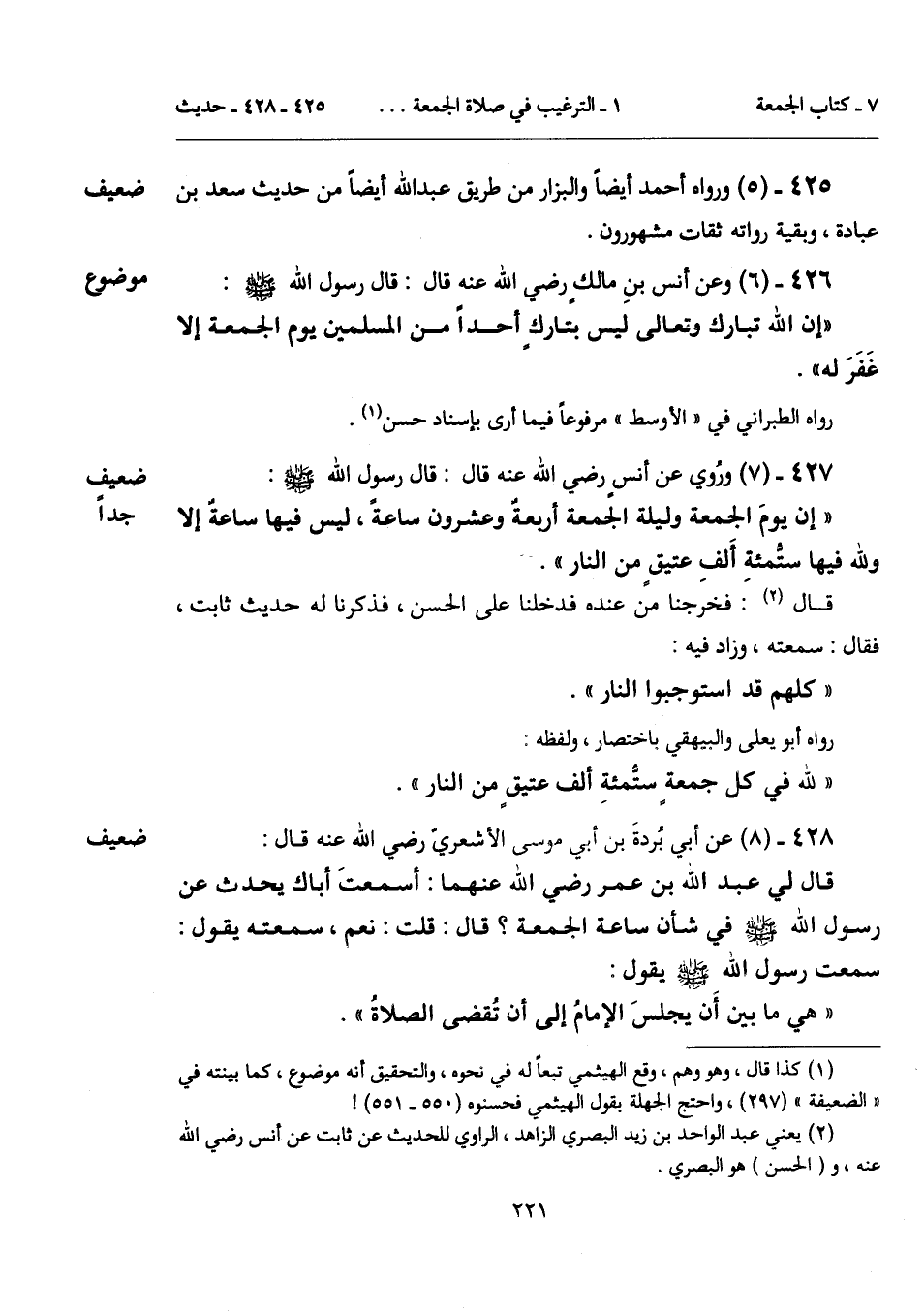 425 - (5) [ضعيف] ورواه أحمد أيضاً والبزار من طريق عبد الله أيضاً من حديث سعد بن عبادة، وبقية رواته ثقات مشهورون.
