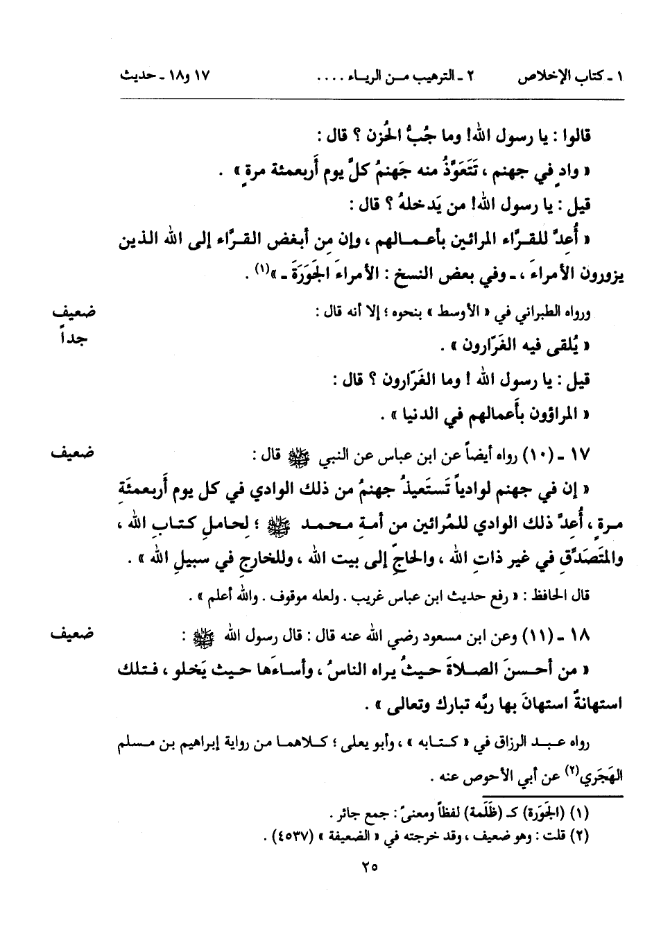 "إن في جهنم لوادياً تَستَعيذُ جهنمُ من ذلك الوادي في كل يوم أَربعمئَةِ مرةٍ، أُعِدَّ ذلك الوادي للمُرائين من أمةِ محمد - صلى الله عليه وسلم -؛ لِحاملِ كتابِ الله، والمتَصَدِّقِ في غير ذاتِ الله، والحاجِّ إلى بيت الله، وللخارجِ في سبيلِ الله".