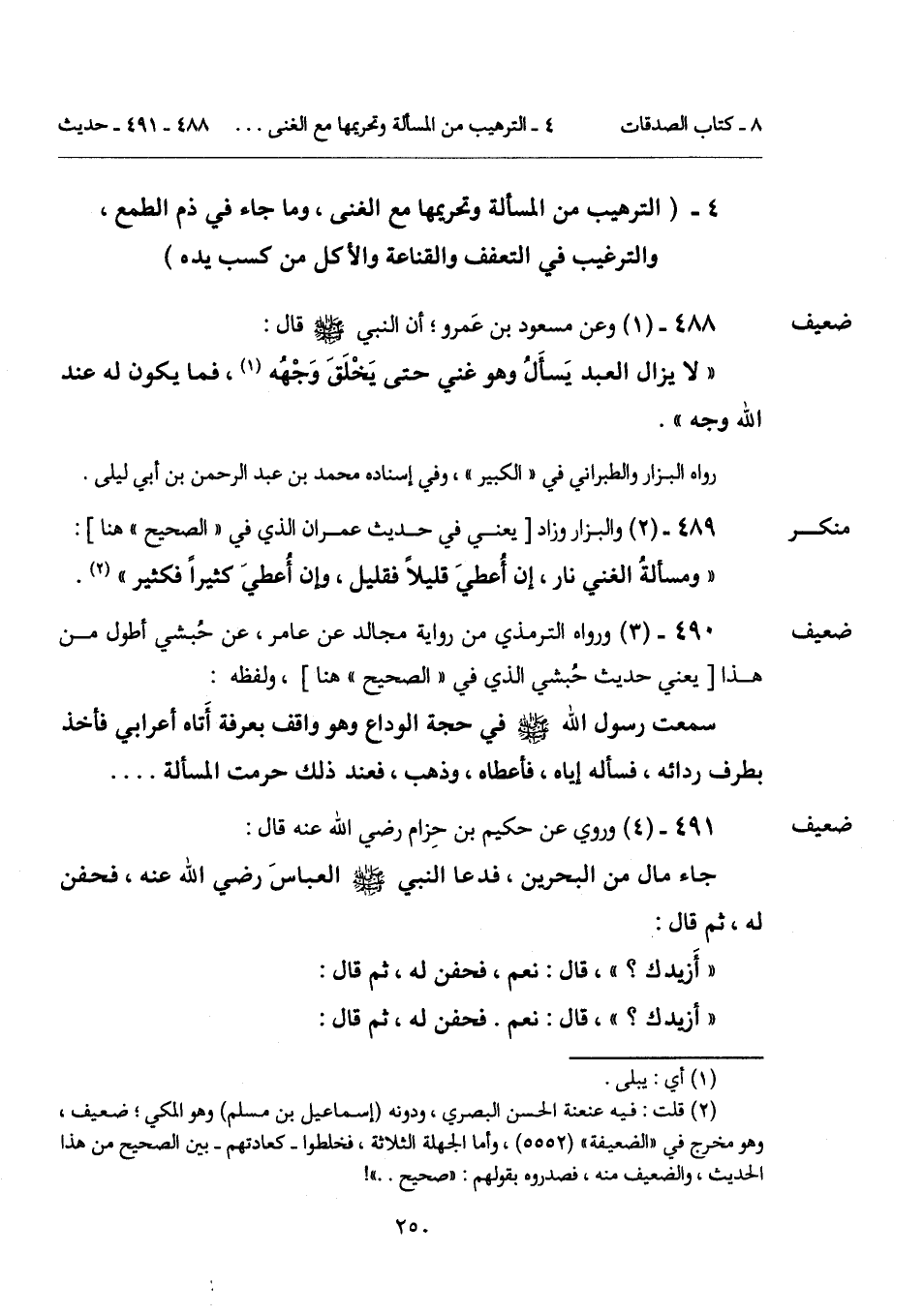 4 - (الترهيب من المسألة وتحريمها مع الغنى، وما جاء في ذم الطمع، والترغيب في التعفف والقناعة والأكل من كسب يده).