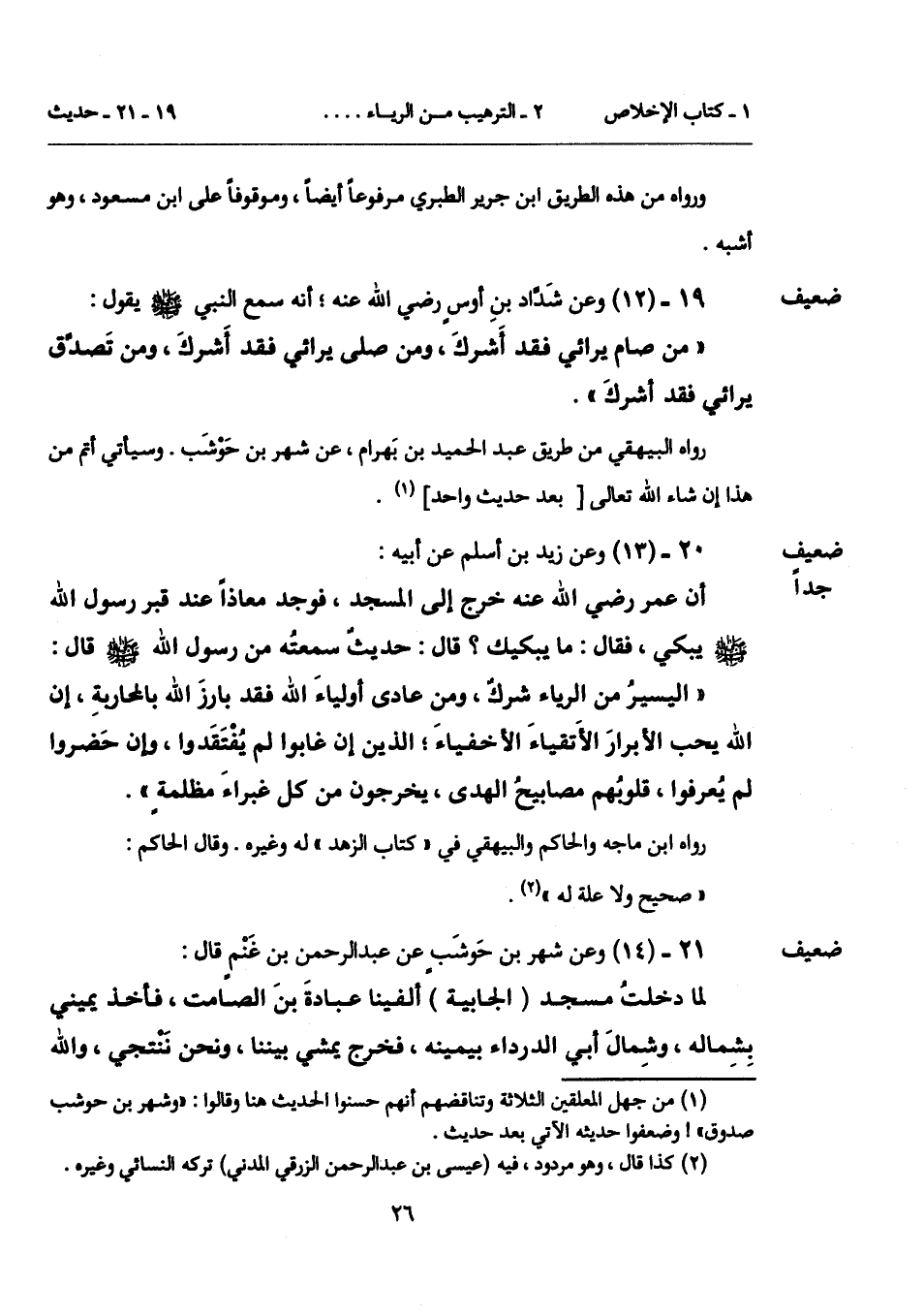 21 - (14) [ضعيف] وعن شهر بن حَوشَبٍ عن عبد الرحمن بن غَنْمٍ قال: