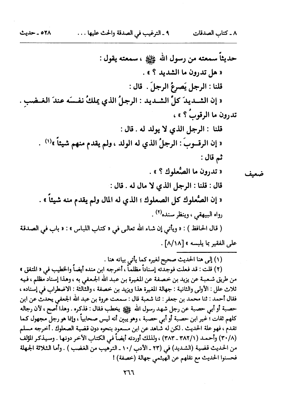 (¬2) قلت: قد فعلت فوجدته إسناداً مظلماً، أخرجه ابن مسنده أيضاً والخطيب في "المتفق" من طريق شعبة عن يزيد بن خصفة عن المغيرة بن عبد الله الجعفي به، وهذا إسناد مظلم، فيه ثلاث علل: الأولى والثانية: جهالة المغيرة هذا ويزيد بن خصفة، والثالثة: الاضطراب في إسناده، فقال أحمد: ثنا محمد بن جعفر: ثنا شعبة قال: سمعت عروة بن عبد الله الجعفي يحدث عن ابن حصبة أو أبي حصبة عن رجل شهد رسول الله - صلى الله عليه وسلم - يخطب فقال: فذكره. وهذا أصح، لأن رجاله كلهم ثقات؛ غير ابن حصبة أو أبي حصبة، وهو يبين أنه ليس صحابياً، وإنما هو رجل مجهول كما تقدم، فهو علة الحديث. لكن له شاهد عن ابن مسعود بنحوه دون قضية الصعلوك. أخرجه مسلم (8/ 30) وأحمد (1/ 382 - 383)، ولذلك أوردته أيضاً في الكتاب الآخر دونها. وسيذكر المؤلف من الحديث قضية (الشديد) في (23 - الأدب/ 10 - الترهيب من الغضب). وأما الثلاثة الجهلة فحسنوا الحديث مع نقلهم عن الهيثمي جهالة (خصفة)!