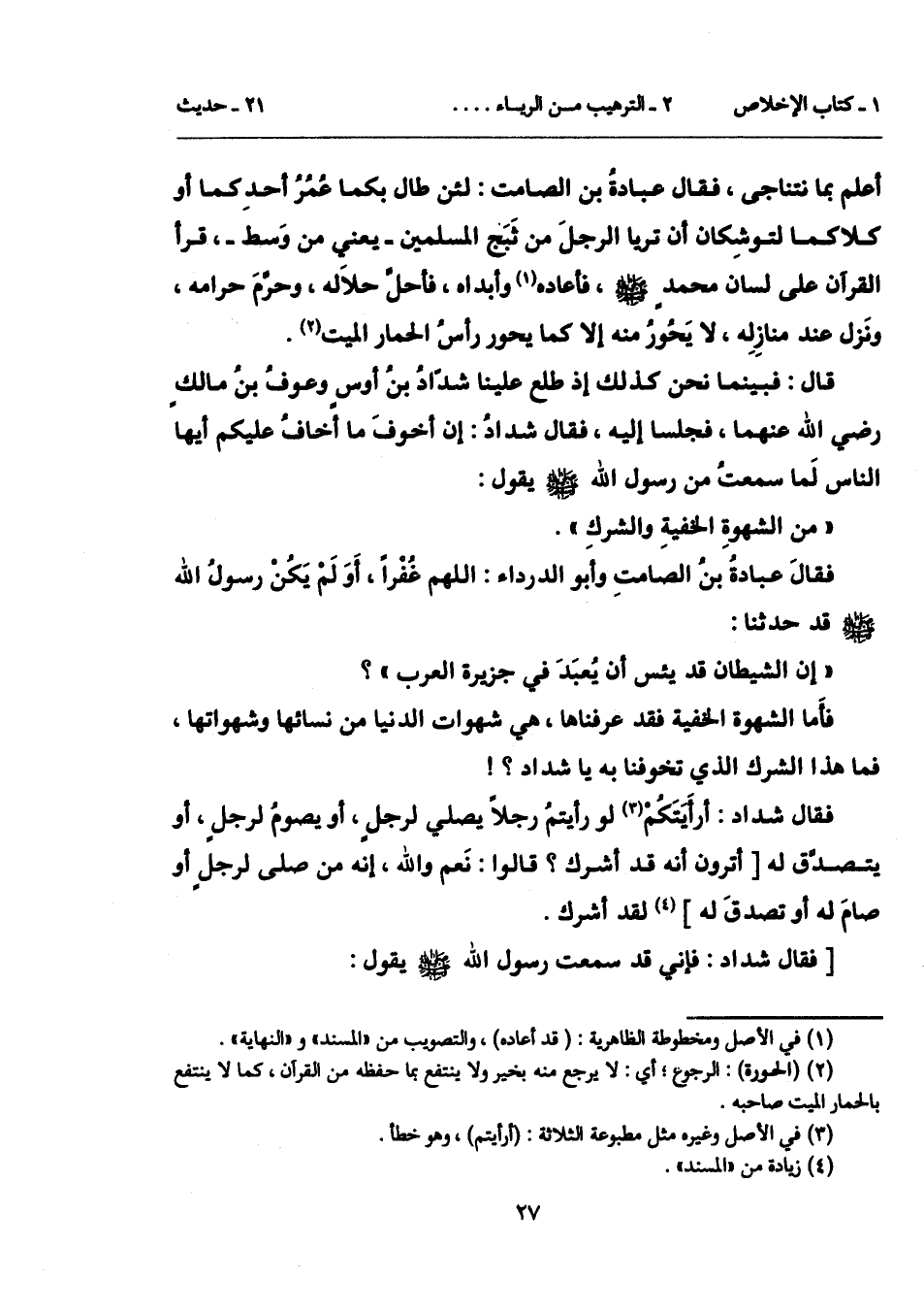 فقال شداد: أرأَيتَكُمْ (¬3) لو رأيتمُ رجلاً يصلي لرجلٍ، أو يصومُ لرجلٍ، أو يتصدَّق له [أترون أنه قد أشرك؟ قالوا: نَعم والله، إنه من صلى لرجلٍ أو صامَ له أو تصدقَ له] (¬4) لقد أشرك.