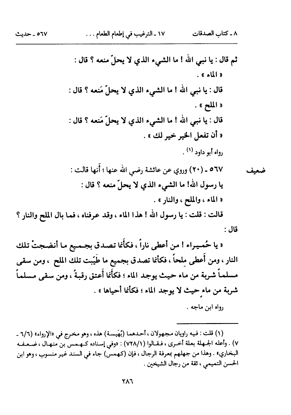 "يا حُميراء! من أعطى ناراً، فكأَنما تصدق بجميع ما أنضجتْ تلك النار، ومن أَعطى مِلحاً، فكأنما تصدق بجميع ما طَيّبت تلك الملح، ومن سقى مسلماً شربة من ماء حيث يوجد الماء؛ فكأَنما أَعتق رقبةً، ومن سقى مسلماً شربة من ماءٍ حيث لا يوجد الماء؛ فكأنما أحياها".