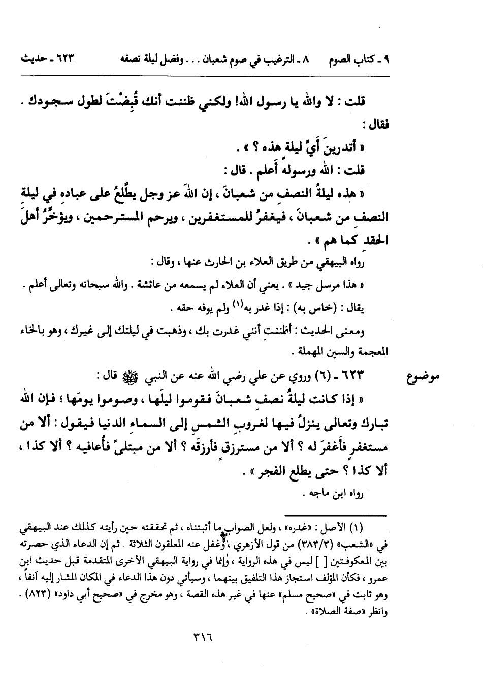 "إذا كانت ليلةُ نصفِ شعبانَ فقوموا ليلَها، وصوموا يومَها؛ فإن الله تبارك وتعالى ينزلُ فيها لغروبِ الشمسِ إلى السماءِ الدنيا فيقول: ألا من مستغفرٍ فأَغفرَ له؟ ألا من مسترزقٍ فأرزقَه؟ ألا من مبتلىً فأعافيه؟ ألا كذا، ألا كذا؟ حتى يطلع الفجر".