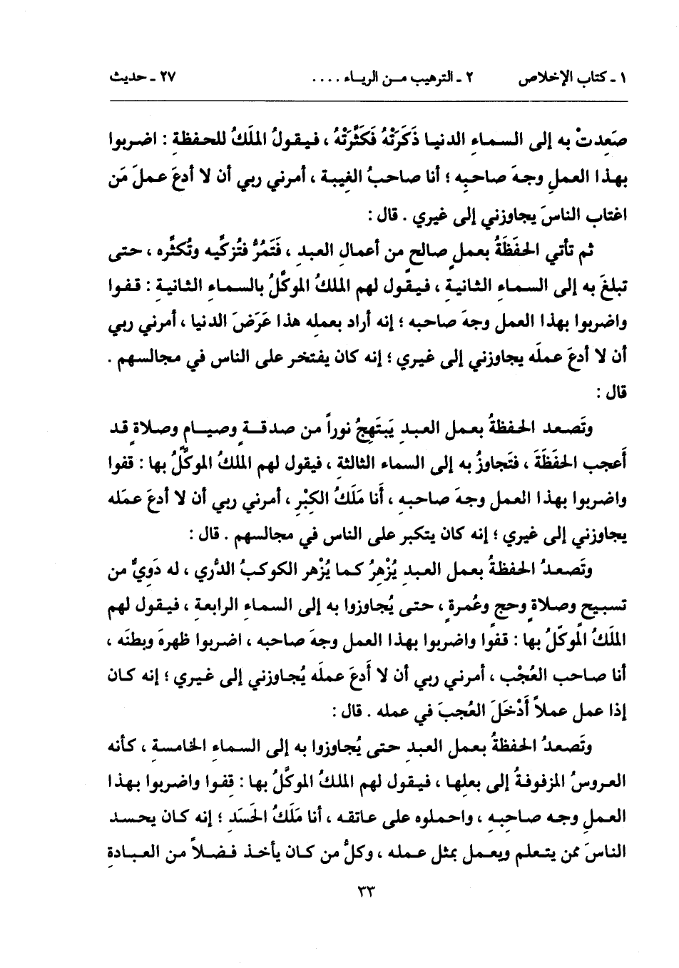 وتَصعدُ الحفظةُ بعمل العبدِ يُزْهِرُ كما يُزْهر الكوكبُ الدُّري، له دَوِيٌّ من تسبيح وصلاةٍ وحجٍ وعُمرةٍ، حتى يُجاوزوا به إلى السماءِ الرابعةِ، فيقول لهم الملَكُ الموكّلُ بها: قفوا واضربوا بهذا العمل وجهَ صاحبه، اضربوا ظهرهَ وبطنَه، أنا صاحب العُجْب، أمرني ربي أن لا أَدع عملَه يُجاوزني إلى غيري؛ إنه كان إذا عمل عملاً أَدْخَلَ العُجبَ في عمله. قال: