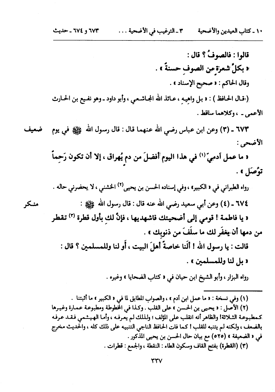 673 - (3) [ضعيف] وعن ابن عباس رضي الله عنهما قال: قال رسول الله - صلى الله عليه وسلم - في يوم الأضحى: