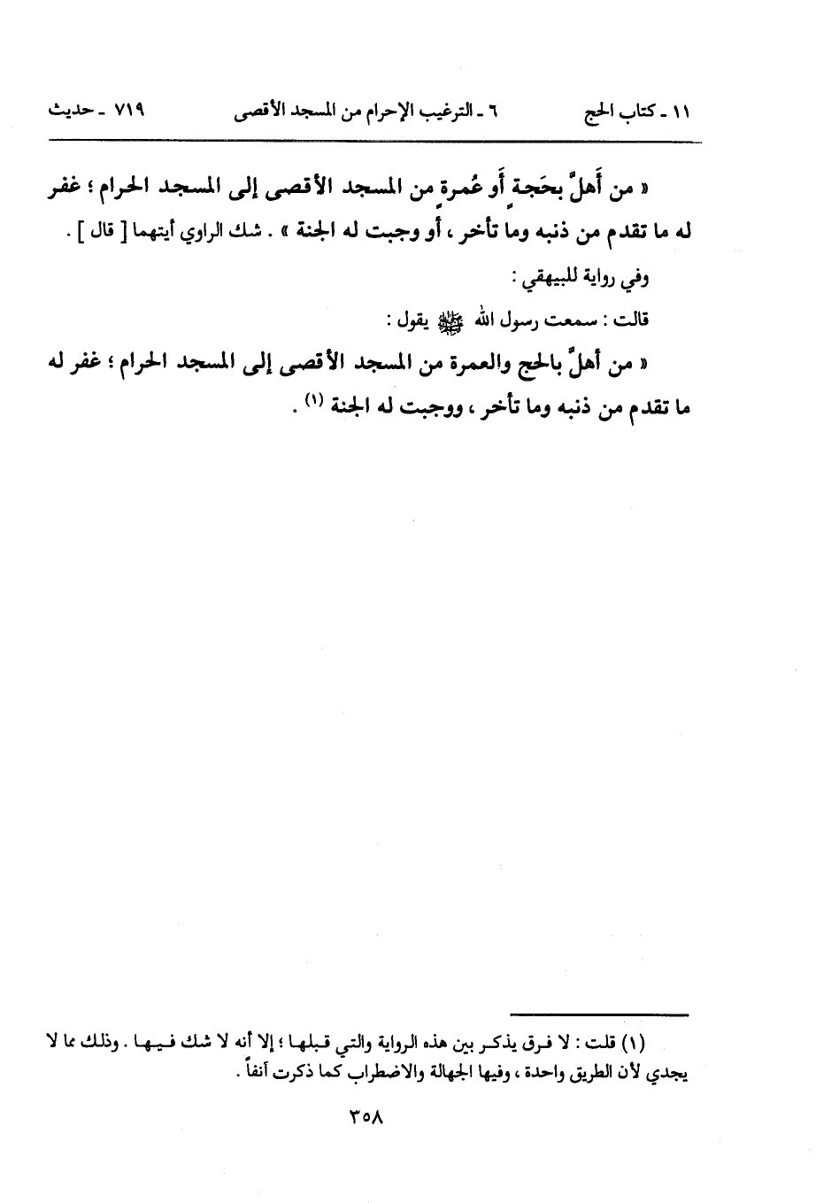 "من أَهلَّ بحَجةٍ أَو عُمرةٍ من المسجد الأقصى إلى المسجد الحرام؛ غفر له ما تقدم من ذنبه وما تأخر، أو وجبت له الجنة". شك الراوي أيتهما [قال].