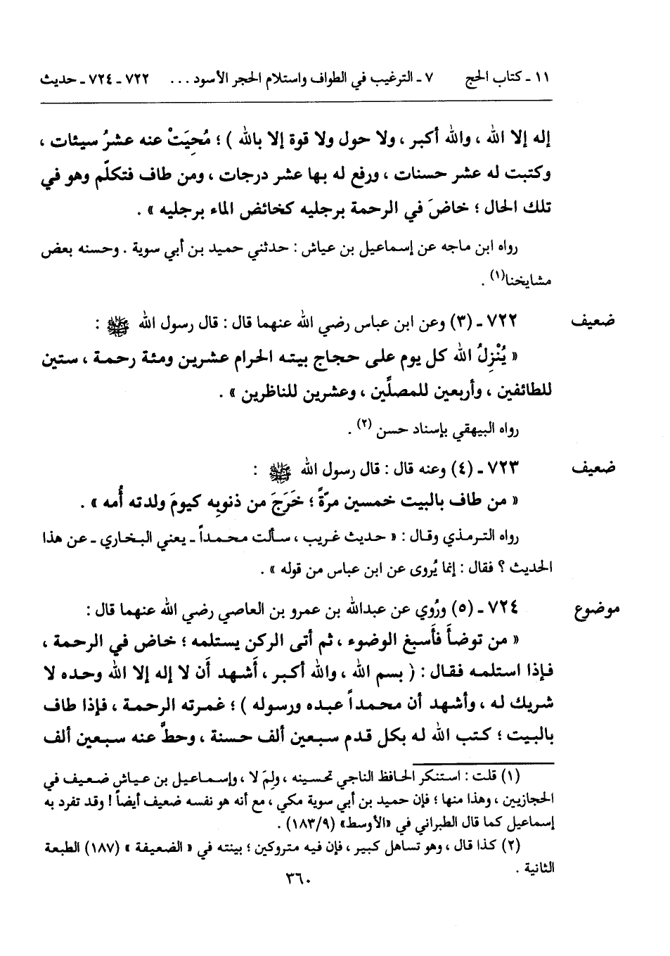 إله إلا الله، والله أكبر، ولا حول ولا قوة إلا بالله)؛ مُحِيَتْ عنه عشرُ سيئات، وكتبت له عشر حسنات، ورفع له بها عشر درجات، ومن طاف فتكلّم وهو في تلك الحال؛ خاضَ في الرحمة برجليه كخائض الماء برجليه".