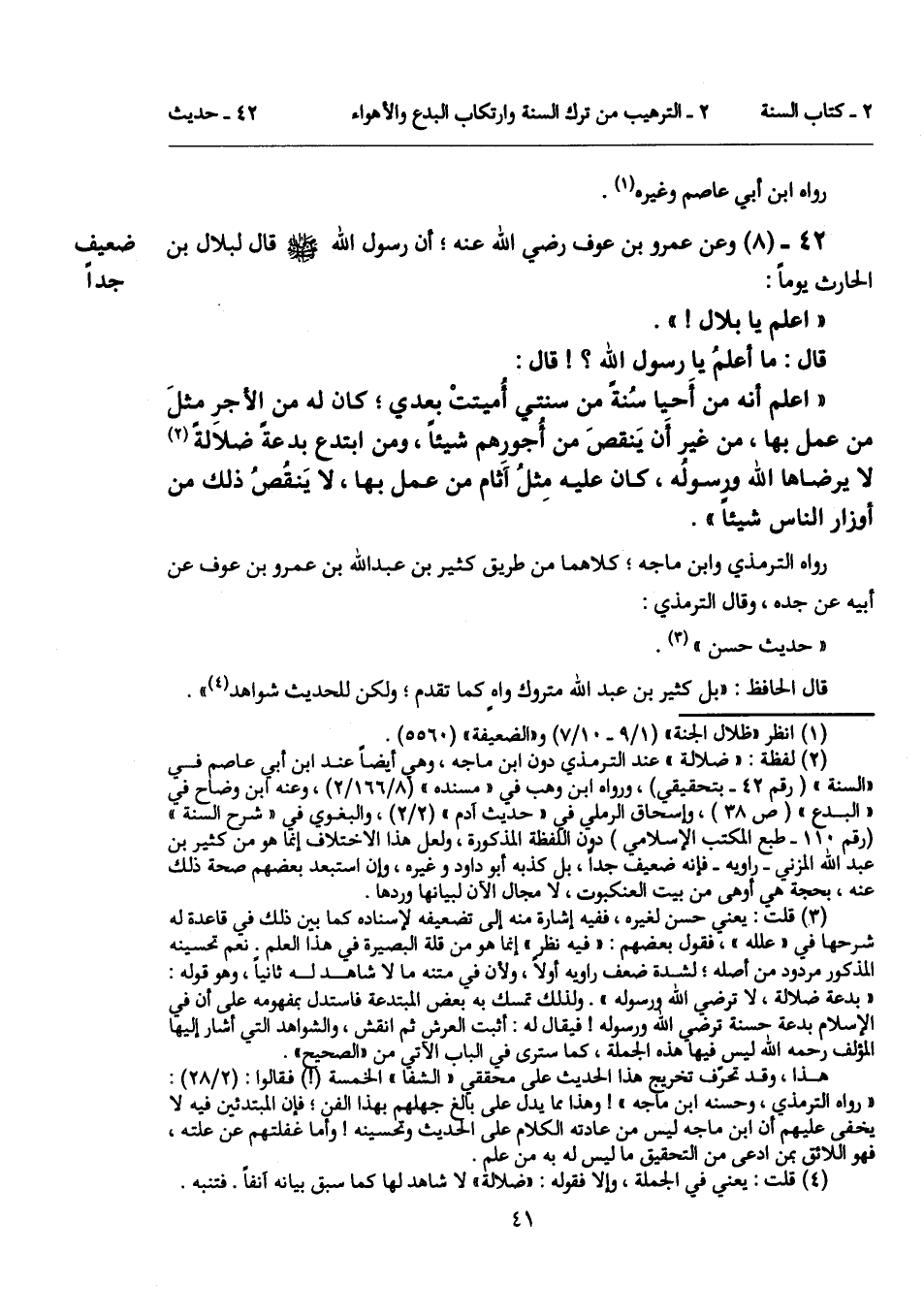 42 - (8) [ضعيف جداً] وعن عمرو بن عوف رضي الله عنه؛ أن رسول الله - صلى الله عليه وسلم - قال لبلال بن الحارث يوماً: